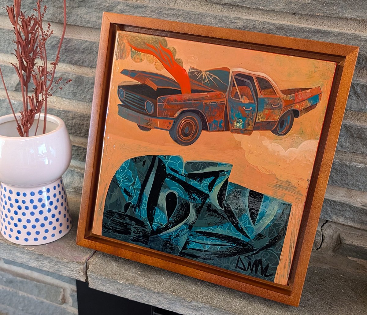 This painting started as a palette next to me at my easel. I used a palette knife to wipe extra paint onto the gesso for texture and color. Using it as car rust and Bondo patina was such a fun idea.
