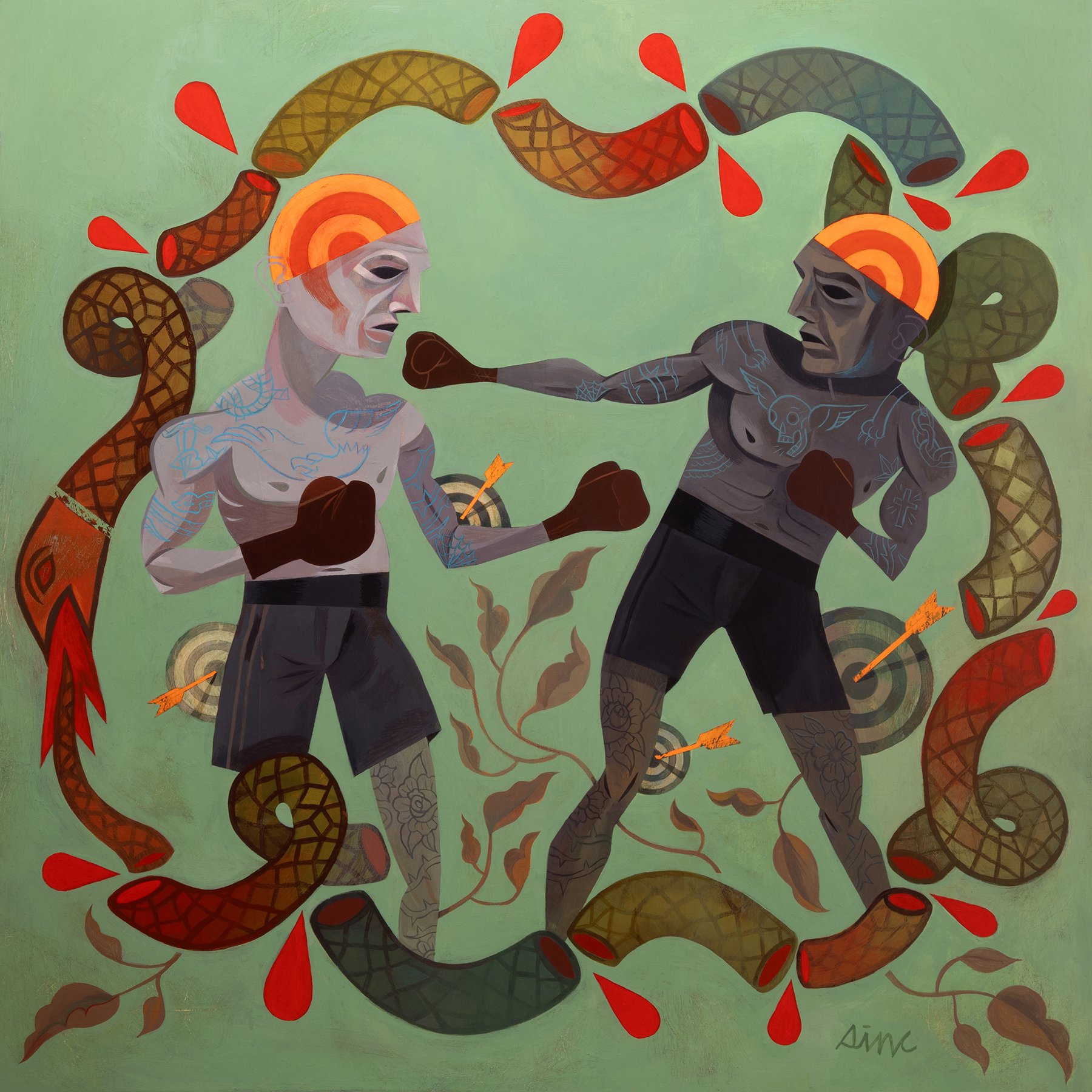 Two opponents, both of them generic and grey. The boxing gloves represent these fools as all bark no bite. In this instance the tattoos, akin to clown makeup, present surface level personas. Like any good contest we love to watch the score climb as points fly. The points are the arrows, merely opinions with prejudice. They always miss the point. If only these two would use their heads this contest have not reached Join or Die levels of stupid. Unfortunately this narrative is timeless.